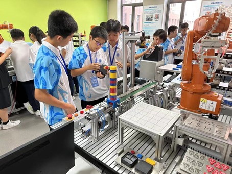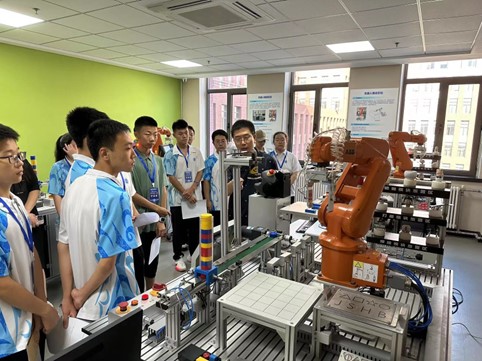 7月24日上午,近20名来自大工附高的高一学子及3名带队老师走进中心,开启了一场沉浸体验式的科创研学之旅。在中心的工业机器人实验室,刘建伟老师给同学们讲解了工业机器人系统的组成模块、操作和编程方法,随后同学们动手操作机器人完成各种姿态调整和动作控制,并编写程序控制机器人实现循迹功能,同学们兴趣盎然并踊跃与老师提问互动。