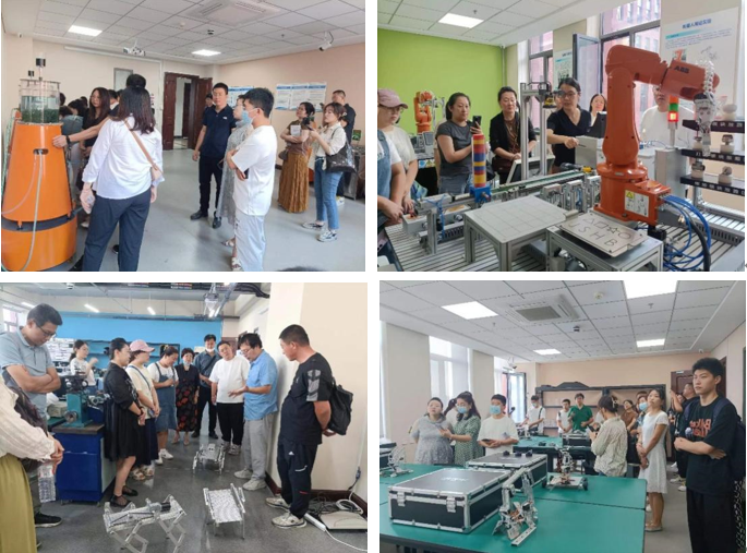 随后,在中心教师的引导下,全市科技辅导员一行分别参观了流体力学与液压传动、工业机器人、机构设计、科创竞赛等四个实验室模块,实操了流体力学和虚实互联的液压实验系统,观看了PLC自动化控制系统和工业机器人搬运及加工工件的工艺流程,了解了中心自制的“基于物联网技术多模控制的凸轮实验装置”以及面向机构综合创新的四足机器人构型设计,交流了无人机、足球机器人及人工智能有关的设备在教学和科创竞赛上的使用情况。