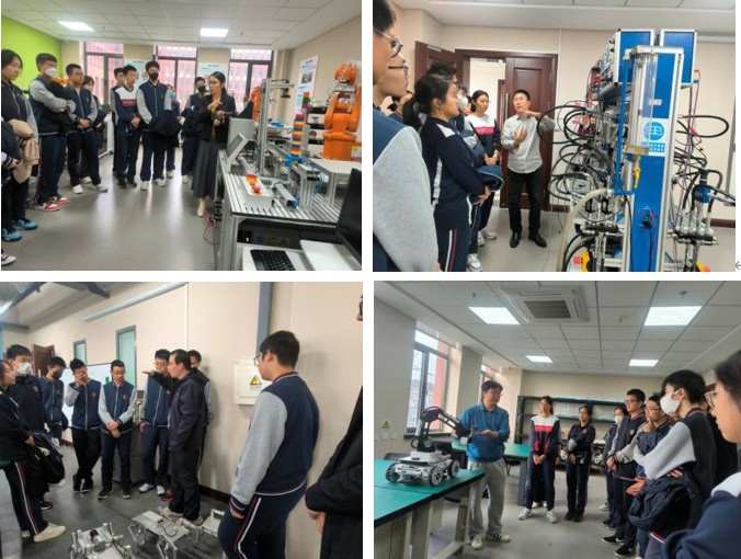 随后,渤海文谷高中学子前往机械工程国家级实验教学示范中心,分组参观考察工业机器人实验室、PLC实验室、流体力学实验室、液压传动实验室、凸轮实验室、大工-创非凡实验室,在专家老师的示范讲解下,聆听了一堂别开生面的“科创实践体验课”,各实验室全程充斥着浓厚的科创探究氛围。走进工业机器人实验室和PLC实验室,韦磊老师系统展示了工业机器人的组成及基本控制方法,亲自指导参观人员进行基本的实验操作并全面介绍了PLC控制器的功能及操作方式;在流体力学实验室和液压传动实验室,刘建伟老师整体介绍了流体传动实验的教学理念与硬件设施,包括雷诺及伯努利实验以及虚实结合的流体传动实验平台;来到凸轮实验室,包海涛老师则向学生们全面讲解了自身研发的面向机构综合创新的四足机器人构型以及凸轮实验机构;在大工-创非凡实验室,尉国滨老师深刻介绍了模块化工业机器人的工作原理与操作方式,引领同学们动手利用不同构型的机器人完成工程绘图以及激光打印,了解掌握小型模块化机器人及足球机器人等的结构组成和知识原理。