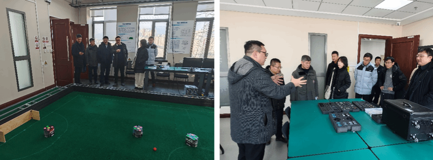 在对实验中心的考察过程中,刘新副院长为来访的一行人介绍了中心近年来在科普基地建设方面做出的举措以及目前设立的科普项目。并重点介绍了工业机器人实验室、PLC实验室、大工-创非凡机器人创新实验室、机器人竞赛实验室等目前承担科普项目最多的实验室。