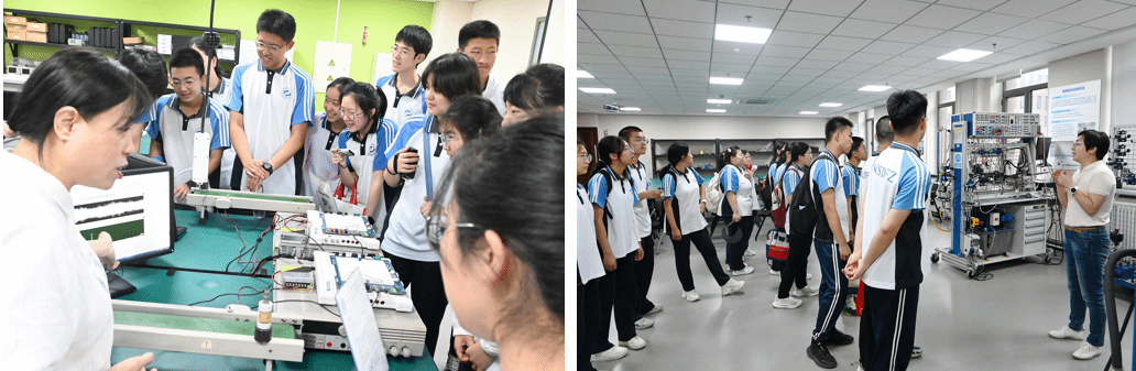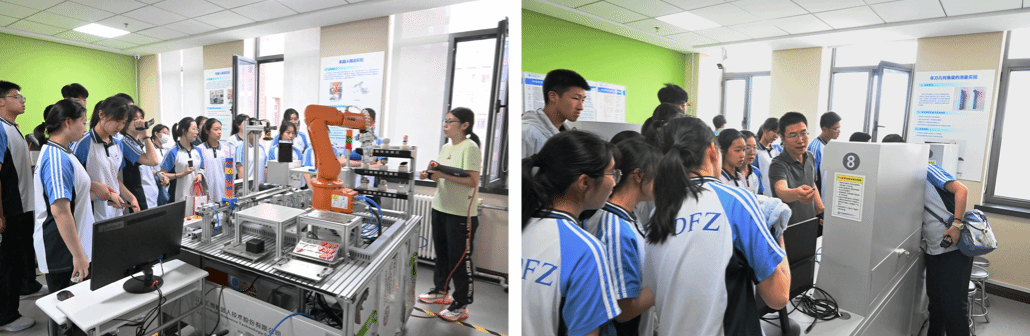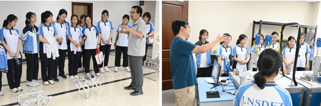 辽师附中的学子们在校长程谟臣的带领下,分批参观了中心和国重两地。在中心的各个实验室中,学生们得以亲身感受科技的力量。工业机器人实验室中,韦磊老师为学生们揭开了工业机器人的神秘面纱,详细讲解了其内部构造和基本控制原理;在PLC实验室,刘建伟老师向学生们展示了如何通过可编程逻辑控制器实现对工业流程的精确控制,让他们领略到了自动化技术的魅力所在;自动控制系统实验室中,温锋老师通过输送带振动信号数据采集实验,让学生们认识到了数据采集在现代工业生产中的重要性;流体传动与控制实验室里,张宏教授结合世界顶级的工业级实验设备,向学生们讲解了液压传动原理及其在大国重器中的重要作用,以及在这样顶级的实验室中开展沉浸式教学的模式;在仿生机械展示环节,包海涛老师引导学生们走进了四足机器人构型设计的世界,启发了他们对机构创新的思考;最后,尉国滨老师在大工-创非凡实验室展示了众多与机器人和人工智能相关的高端设备,让学生们对未来科技充满了期待和憧憬。