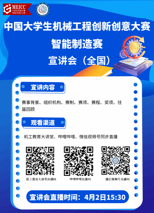 为培养大学生的创新能力,现按照2024年中国大学生机械工程创新创意大赛智能制造赛执委会相关通知精神,开展2024年大连理工大学机械工程创新创意大赛智能制造赛工作。现将相关工作安排,通知如下:
